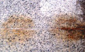 1、石材原材含鐵量較高(如美國白麻,黃砂巖等),空氣中二氧化碳和水侵入石材表面,與石材內(nèi)部的鐵質(zhì)反應(yīng)生成二氧化鐵,并透過石材毛細(xì)孔排出,形成銹斑;